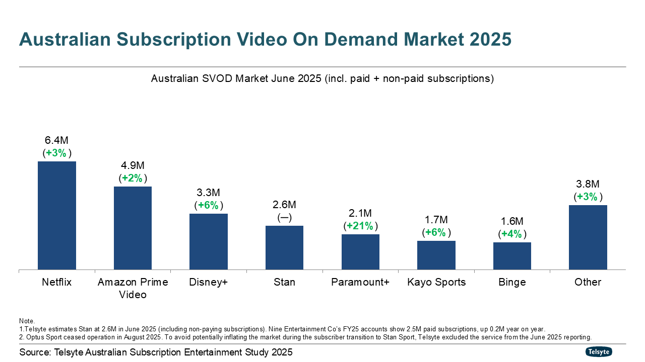 Telsyte reports Stan at 2.6 million in June 2025, include non-paying subscriptions. Nine’s reporting shows 2.5 million paid subscriptions, up 0.2 million year-on-year.